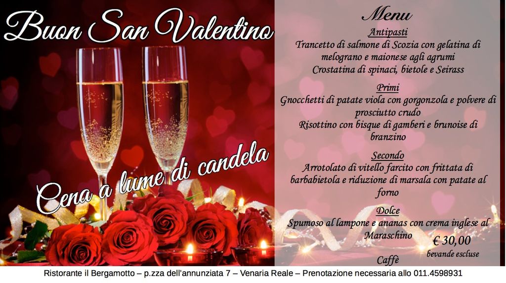 Vieni a passare con noi, al Ristorante Il Bergamotto di Venaria Reale, la serata più romantica dell’anno degustando il nostro menu.