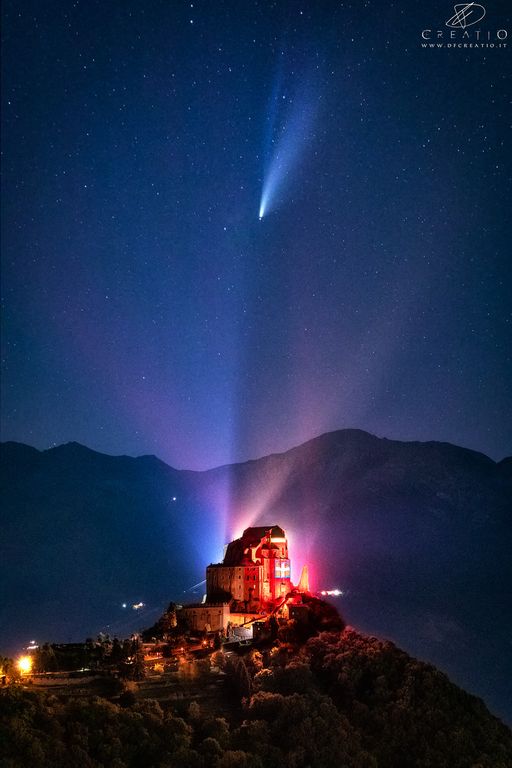 La Sacra di San Michele, luogo simbolo della Regione Piemonte, è parte attiva del 50° anniversario della fondazione dell'Ente. Da domenica 19 luglio, fino al 26 il monumento religioso sarà illuminato anche con la bandiera simbolo della Regione. Il Drapò come simbolo d'identità, di tradizione storica e di appartenenza. Questa speciale illuminazione ha destato grande interesse da parte di tutta la comunità che si è espressa favorevolmente attraverso i social. Un segno di rinascita dopo il periodo di chiusura dettata dall'emergenza Coronavirus. In questo senso continua l'impegno della struttura per offrire più margini temporali di visita. In questa ottica sabato 25 luglio i cancelli della Sacra di San Michele rimarranno aperti, in modo straordinario, dalle 9,30 alle 22,00. Per i visitatori sarà anche l'occasione per ammirare, oltre il consueto meraviglioso panorama fino alla Collina di Torino, anche il passaggio della Cometa Neowise. Una lunga scia luminosa è lo spettacolo che sta offrendo in questi giorni la cometa. Prende il nome dal telescopio spaziale che l'ha scoperta. La Cometa, proprio il 25 luglio raggiungerà il massimo avvicinamento al Sole aumentando la sua luminosità. Un'occasione assolutamente da non perdere per tutti e soprattutto per gli amanti dell'astronomia. Spiega il Rettore don Claudio Papa. "L'apertura del 25 luglio vuole essere ancora di più un segno della nostra presenza sul territorio piemontese. Crediamo che possa essere l'occasione di visita anche per chi arriva da più distante. La Sacra di San Michele, la bandiera luminosa e la cometa sono gli ingredienti di una serata magica che si potrà vivere qui sul Pirchiriano".