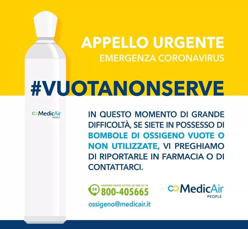 Innanzitutto l'appello dei farmacisti, partito dopo un tavolo di confronto che ha visto protagoniste l’Agenzia Italiana del Farmaco (Aifa), Federfarma e Assogastecnici (le aziende che producono e distribuiscono gas speciali e medicinali). “Se avete a casa bombole di ossigeno che non usate, riportatele in farmacia”, dicono all'unisono, seguite dagli appelli delle singole farmacie che pubblicano la stessa richiesta nelle loro bacheche e con cartelli apposti all'ingresso. “A mancare non è l'ossigeno – aveva spiegato qualche giorno fa Aifa – ma i contenitori. Ci sono molti pazienti che non ne hanno più bisogno ma preferiscono tenere le bombole per sicurezza, o magari anche solo per pigrizia o dimenticanza. Ma in questo momento che c'è carenza è fondamentale che le restituiscano”. Una volta riconsegnate, infatti, le bombole possono essere sanificate e riempite di ossigeno terapeutico per un nuovo paziente.