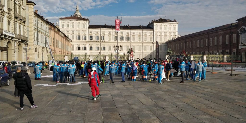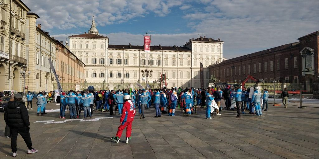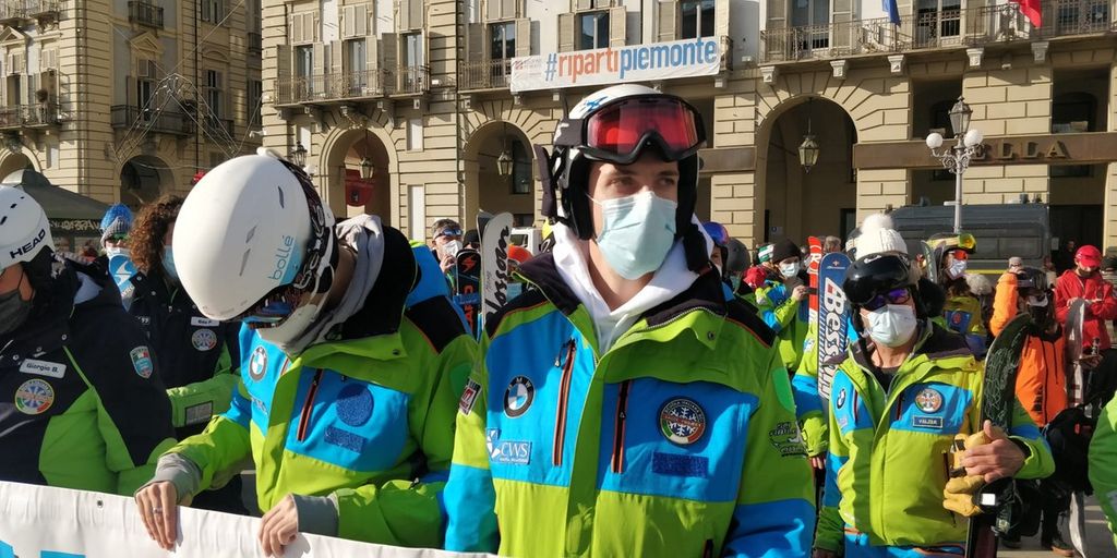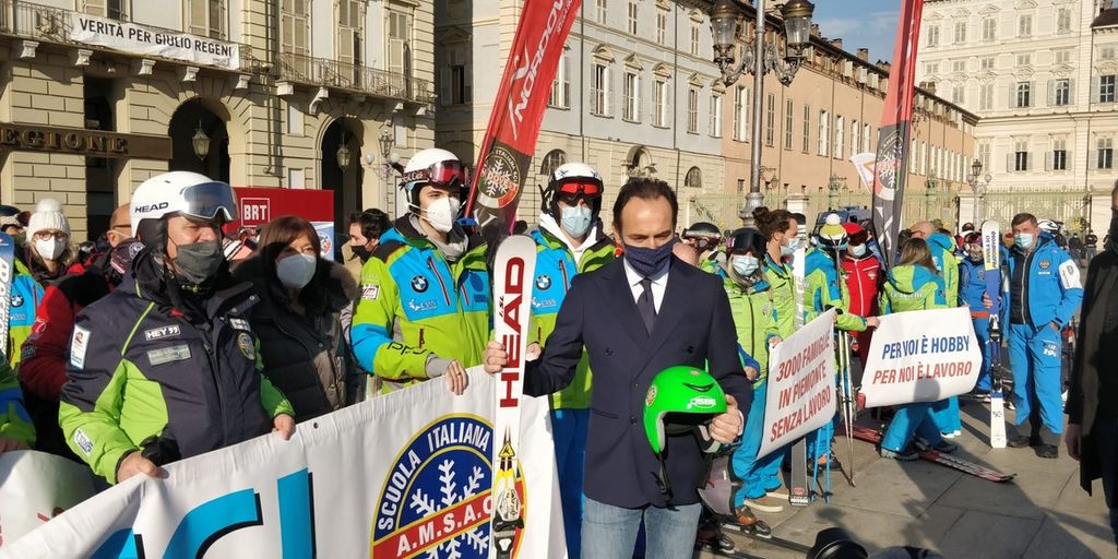 Centinaia di maestri di sci, con abbigliamento tecnico e sci ai piedi, si sono ritrovati stamattina sotto la sede della Regione Piemonte, a Torino, per chiedere la riapertura delle piste e la possibilità di lavorare durante le feste di Natale.