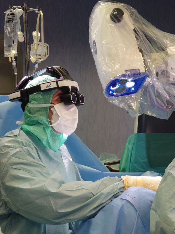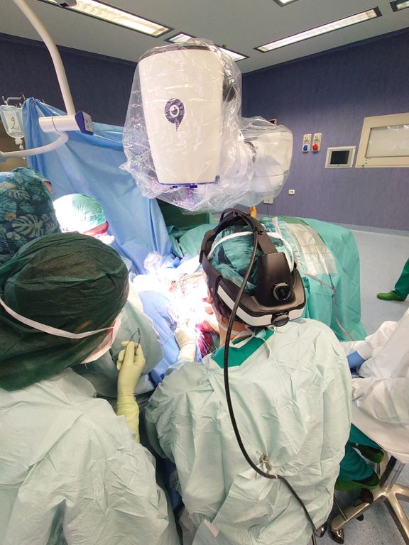 Il microscopio trasmette l’immagine del campo operatorio a un occhiale usato dall’operatore, che in tal modo può lavorare in maggiore ergonomia, ma soprattutto potendo utilizzare lo scafandro di protezione nei casi Covid positivi, cosa impossibile con i microscopi tradizionali che non permettono per l’utilizzo l’interposizione di protezioni tra gli occhi del chirurgo e il sistema di lavoro.