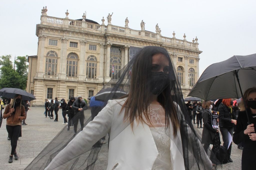 La protesta in piazza Castello del "settore wedding", con una sposa vestita a lutto (foto e video: Andrea Parisotto)