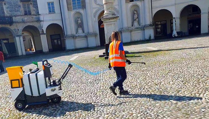 Il nuovo robot sanificatore elettrico in dotazione per igienizzare gli arredi urbani, è in grado di riconoscere e seguire automaticamente l'operatore evitando ostacoli fissi e mobili grazie all’innovativo sistema follow me, che consente di svolgere il lavoro in modo più accurato e confortevole, lasciando le mani libere per usare la lancia nebulizzatrice. In base al tipo di pulizia in programma, un doppio serbatoio permette di dosare la miscela a base di acqua e igienizzante. “È un servizio pensato per luoghi molto frequentati, come i giochi per bambini nei parchi, - precisa Lorenzo Destefanis – con il quale possiamo mantenere igienizzati i manufatti nei mesi successivi al tradizionale lavaggio di inizio stagione con idropulitrice: la sanificazione prevede interventi più rapidi e con un minor consumo di acqua, che possiamo quindi programmare con maggiore frequenza”.