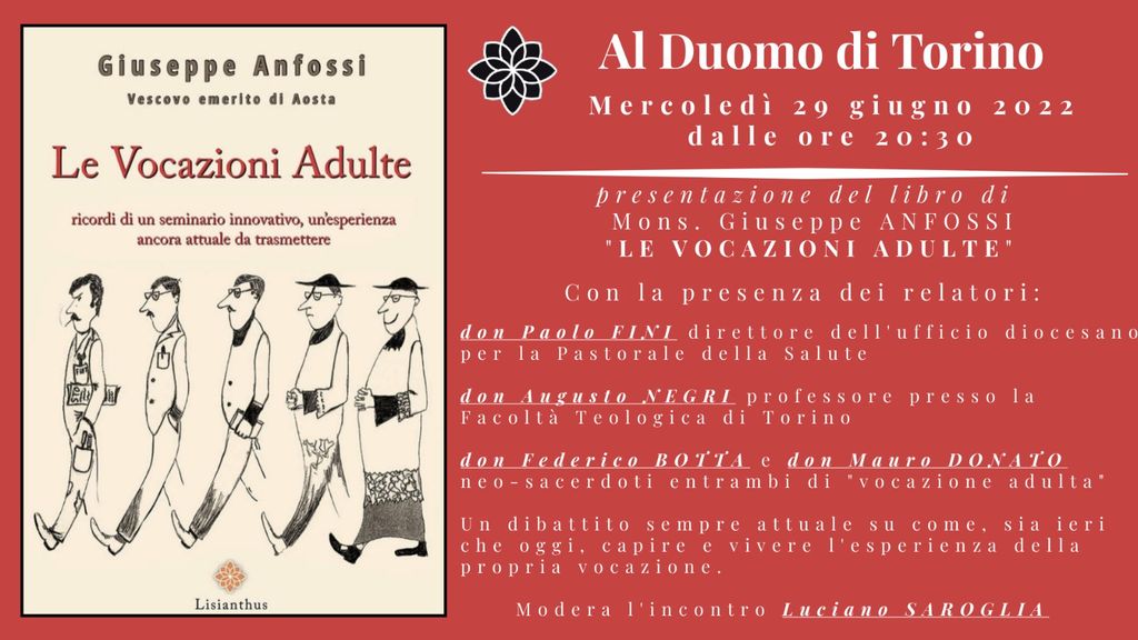 Monsignor Giuseppe Anfossi, con quest'ultima opera, ci parla in maniera magistrale e allo stesso tempo in modo semplice e agevole delle vocazioni adulte, ovvero di quelle persone che hanno già percorso un tratto di vita ricco e intenso e che scoprono, in età adulta, la chiamata a seguire il Signore. Il Vescovo emerito di Aosta, quindi, passa in rassegna i ricordi degli anni in cui venne istituito il Seminario Regionale Piemontese per le Vocazioni Adulte. Richiamando esperienze di vita, fa riflettere il lettore sull'importanza delle vocazioni adulte, percorso umano e spirituale ancora oggi attuale e certamente da trasmettere alle nuove generazioni.