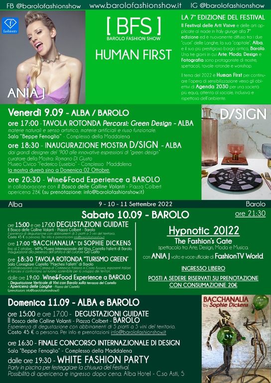Il Barolo Fashion Show ritorna protagonista nel cuore del sito dei “Paesaggi vitivinicoli di Langhe-Roero e Monferrato”, festival internazionale delle arti visive in cui arte, design ecosostenibile, moda e fotografia sono al centro dell'attenzione, condensate nella valorizzazione della cultura del territorio e perseguendo gli obiettivi dell'Agenda 2030: “Human First” (questo il tema della kermesse) avrà quindi come palcoscenico le colline Patrimonio mondiale Unesco, da venerdì 9 a domenica 11 settembre.