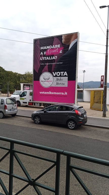 Sono manifesti elettorali. O quasi. Diciamo che invitano gli elettori a votare, ma una proposta politica un po' diversa: "Mandare a escort l'Italia", con una scritta cancellata sotto, ma che si può perfettamente intuire e che completa in maniera decisamente più "tradizionale" il modo di dire. Il nome del candidato? Mike Morra.