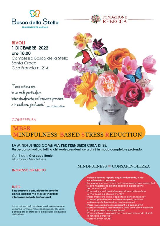 Si terrà giorno 1 dicembre presso il Complesso Bosco della Stella Korian di Rivoli (TO) la conferenza introduttiva ‘La Mindfulness come via per prendersi cura di sé’, a cura del Dott. Giuseppe Reale, istruttore di Mindfulness.