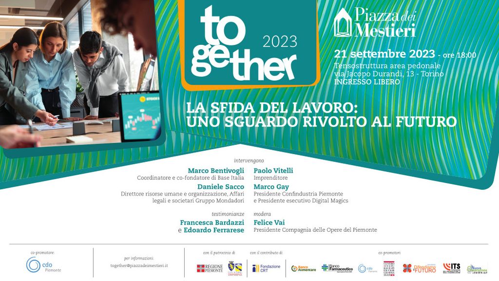 La sfida del lavoro: uno sguardo rivolto al futuro. Ė questo il titolo dell’incontro organizzato da Cdo Piemonte all’interno della rassegna “TOgether. Protagonisti all'opera”. Una riflessione sulle nuove realtà occupazionali e sulla loro evoluzione. In programma, il faccia a faccia tra due giovani alle prime esperienze di lavoro con esperti e esponenti del mondo dell’impresa.