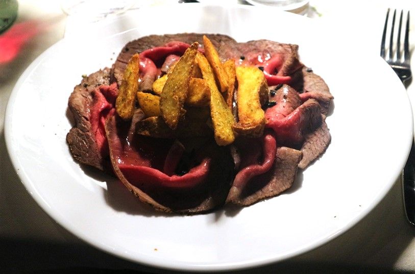 Portata principale il Roast-beef in Crosta di erbe aromatiche, servito con spicchi di patate,