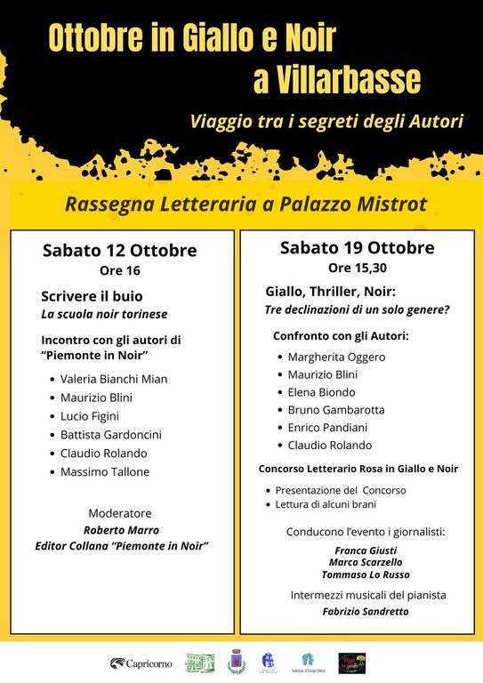 A Palazzo Mistrot (via alla Fonte 8) la rassegna letteraria «Ottobre in Giallo e Noir a Villarbasse», con due appuntamenti appassionanti.
