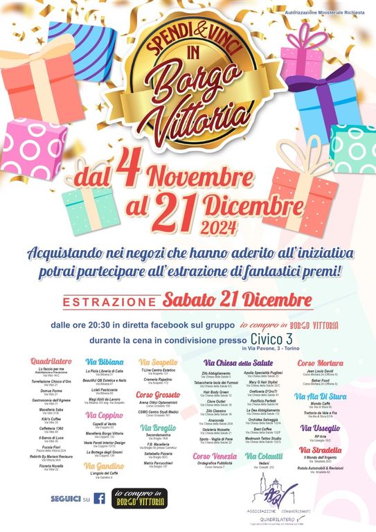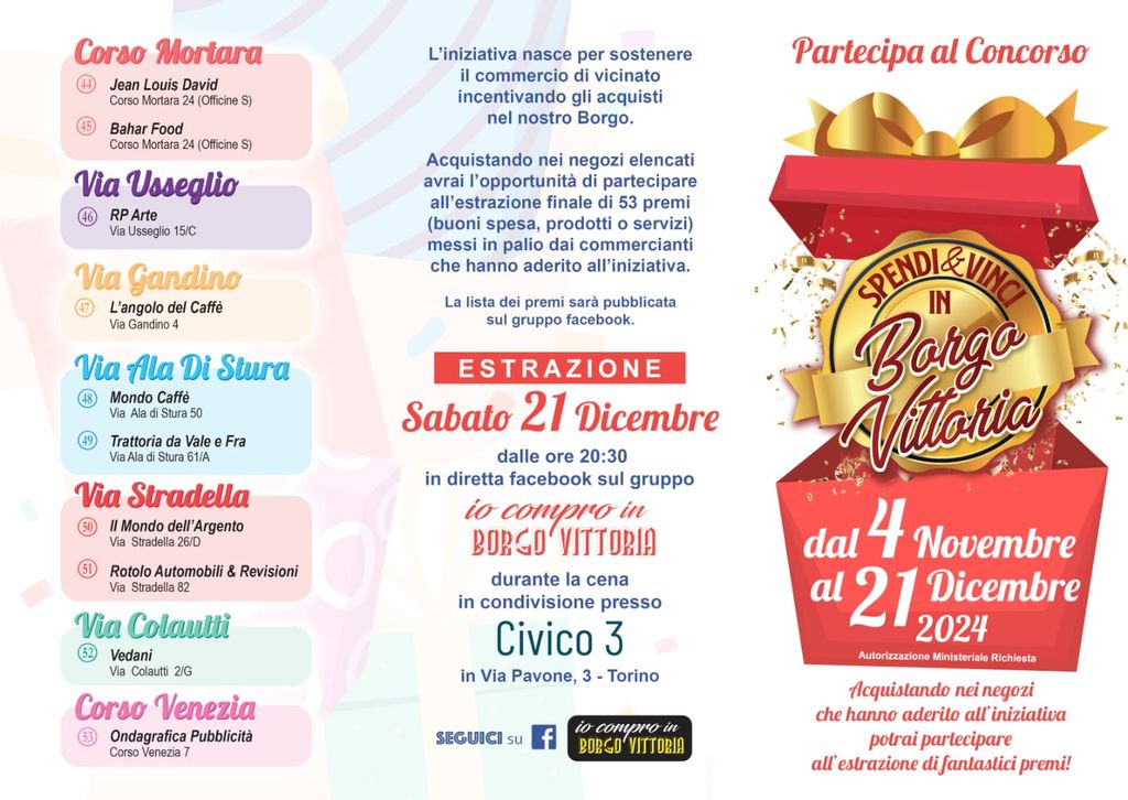 Quest'anno, dal 4 novembre al 21 dicembre per ogni acquisto fatto nei negozi che aderiscono all'iniziativa nel quartiere Borgo Vittoria a Torino, verrà dato un biglietto da compilare con nome, cognome e numero telefonico, basterà inserirlo nell'apposita scatola. Ne sarà presente una per ciascuna attività e il 21 dicembre tutti i biglietti contenuti nelle 54 scatole presenti negli esercizi commerciali, saranno inseriti in un'unica scatola grande e il 21 dicembre dalle ore 20.30, durante una cena in condivisione con i commercianti stessi, ci sarà l'estrazione in diretta fb sul gruppo "Io Compro In Borgo Vittoria". Ma non finisce qui, perchè ci sarà l'estrazione di un super premio finale: i fortunati vincitori si aggiudicheranno una crociera per 2!!!