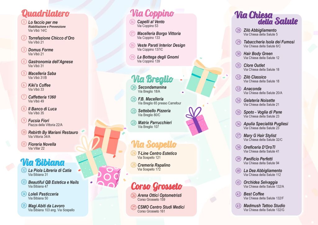 Ecco tutti i negozi e le attività che aderiscono all’iniziativa, strada per strada:QUADRILATERO
