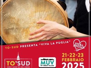 Dopo due week end di successo TO-SUD  “Viva la Puglia”  propone un altro appuntamento: venerdi 21, sabato 22 e domenica 23 febbraio, dalle 11.00  alle 23.00  un viaggio tra i  sapori, colori e folklore nel Sud con ingresso gratuito, in una struttura coperta e riscaldata a Torino, in Strada della Campagna 298 (angolo Via Reiss Romoli ) trovi “MuV – My Urban Village uno spazio eventi al coperto, accogliente e dotato di tutti i servizi, tra cui un ampio parcheggio.