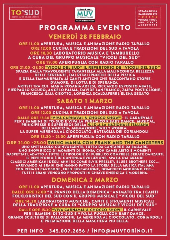 Dalle ore 15.30 : “Viva Carnaval & Chocco Show” il Carnevale per i Bambini di TO-SUD e Viva la Puglia con Baby Dance, Musical e Principesse e Supereroi della N.I.D.A la Nazionale Italiana dell’Amicizia, Animazione , Willy Wonka. La Super Merenda al Cioccolato. Battaglia dei coriandoli.