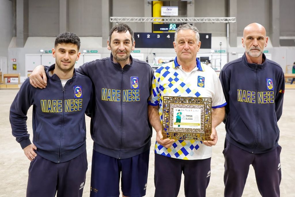 Il trofeo più prestigioso e ambito, quello della storica gara a quadrette (231 al via) è finito, per la prima volta, nella bacheca della Bocce Mondovì grazie a Luca Baccino, Mauro Renato Carello, Giorgio Cavallo e Guillermo Sebastian Montemerlo, i quali al termine di un’infinita finale hanno avuto la meglio per 8-7 sui trevigiani della Marenese di Mareno di Piave (Ivan Soligon, Lino Frare, Alessandro Porello e Franco Soligon). Per la formazione cuneese prestazioni da album dei ricordi per Carello e per l’argentino Montemerlo (due titoli mondiali all’attivo), premiati rispettivamente con il Memorial Arrigo Caudera e il Memorial Beppe Andreoli quali miglior puntatore e miglior bocciatore. Per il comprensorio monregalese non si tratta del primo trionfo assoluto nella Targa d’oro. Nell’ormai lontano 1994 ad alzare il trofeo erano stati infatti Gonella-Ferraro-Broccardo-Lubatti (Le Valli Monregalesi di Niella Tanaro). Sul podio 2025 sono salite altre due compagini piemontesi: i campioni uscenti della Perosina (Collet, Janzic, Mana e Data) e la Brb Ivrea (Capello, Graziano, Nari, Maina), questi ultimi superati al fotofinish in semifinale da Baccino e compagni. Migliore tra le formazioni liguri, ancora una volta, la Chiavarese (Bunino, Griva, Zucca, Bresciano), eliminata nei quarti.
