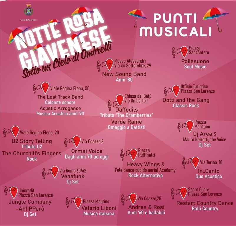 E la Notte Rosa giavenese del 7 giugno, a partire dalle 18, sarà ricca di eventi: oltre quindici gruppi musicali che si esibiranno nelle diverse piazze; dj set; bancarelle; street food, birra artigianale e naturalmente negozi e locali aperti.