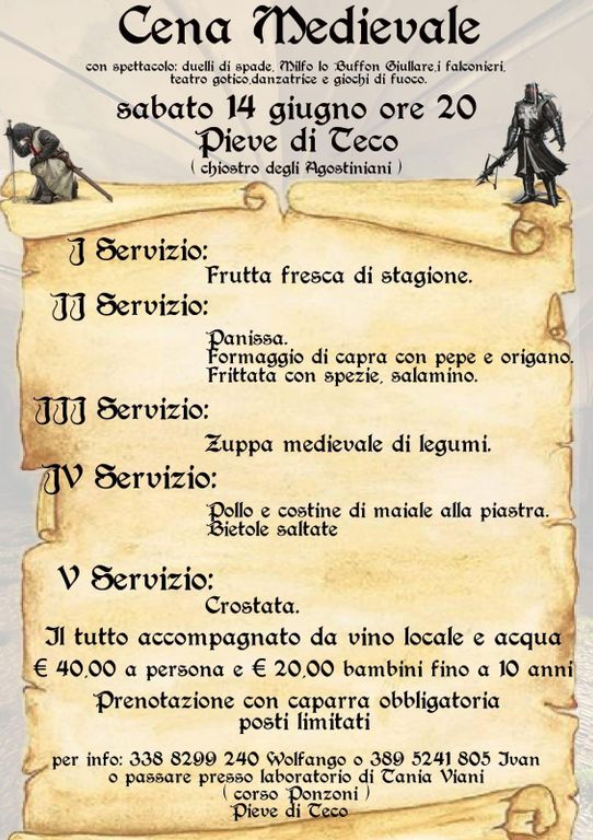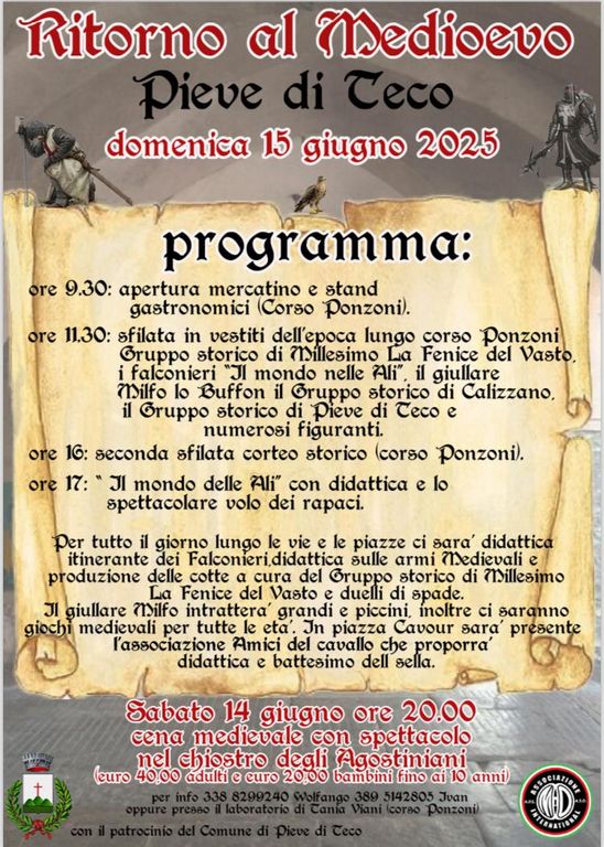 Appuntamento da non perdere, sabato 14 e domenica 15 giugno, a Pieve di Teco con 'Ritorno al Medioevo'. Si inizia al chiostro degli Agostiniani, a partire dalle ore 20, con la 'cena medievale' dove si svolgerà anche lo spettacolo di duelli di spade Presenti poi, falconieri, Milfo lo buffon giullare, danzatrici e giochi di fuoco e momenti di teatro gotico.