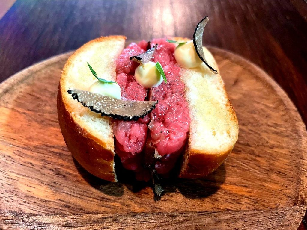 L’hamburger home-made al tartufo nero, con tartare di fassona piemontese e maionese all’uovo: una creazione che gioca con le forme della street food, ma porta in tavola raffinatezza da alta cucina. Il panino, morbido e dorato, si apre su una generosa tartare di fassona piemontese, fresca e appena condita. La maionese all’uovo dona una cremosità voluttuosa, mentre le lamelle di tartufo nero esaltano il tutto con il loro aroma inconfondibile. Il contrasto tra la delicatezza della carne cruda e l’umami profondo del tartufo crea un equilibrio sorprendente, quasi sensuale al palato.