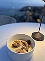 Tra le portate servite: ostrica fritta con bisque di gamberi e salsa al caramello; carpaccio di tonno con fichi freschi, cipolla in agrodolce e salsa alle foglie di fico; risotto ai gamberi di Sanremo e tartufo nero; tagliolino con gamberi, zafferano e fiori di zucchina.