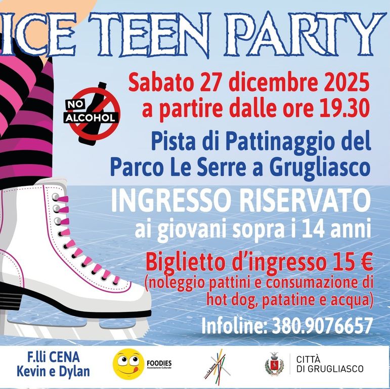 Il primo appuntamento, "Ice teen party", è in programma sabato 27 dicembre, dalle 19.30. La serata, riservata ai giovani sopra i 14 anni, prevede un biglietto d’ingresso a 15 euro comprensivo di noleggio pattini, acqua, hot dog e patatine (informazioni al numero 380/9076657).