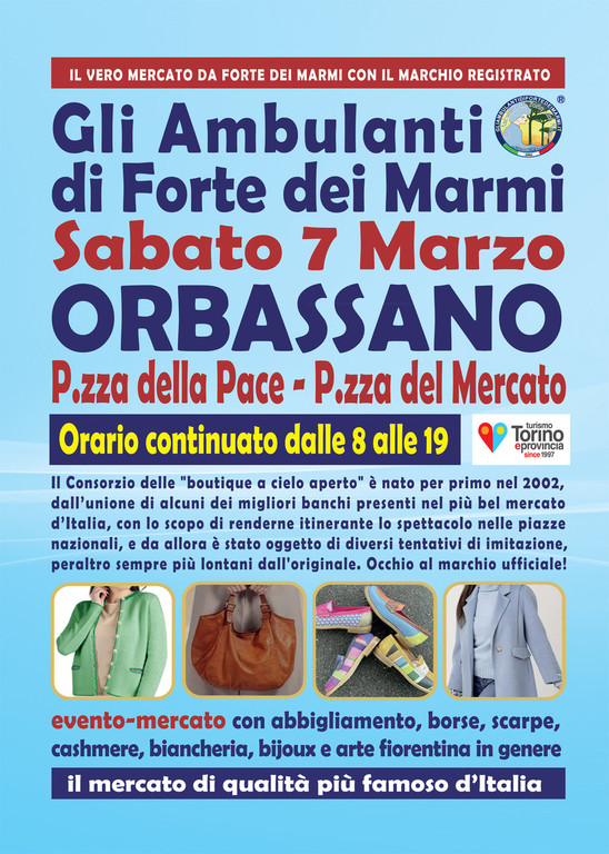 Si comincia a pensare al “cambio di stagione” e dunque arriva propizia la presenza de Gli Ambulanti di Forte dei Marmi®, le bancarelle del mercato di qualità più famoso d’Italia (da non confondere con alcuni tentativi di imitazione del loro originale format che circolano in regione), che, dopo tanti successi in giro per la Penisola, tornano a grandissima richiesta nel Torinese con il loro show itinerante, all’insegna del meglio del Made in Italy artigianale e delle ultime tendenze della moda.  Si potranno infatti ammirare le ormai mitiche boutique a cielo aperto® dell’originale Consorzio sabato 7 marzo ad ORBASSANO, in Piazza della Pace (la piazza del mercato), per un’iniziativa come sempre attesissima. Dunque, un’occasione da non perdere assolutamente per le legioni di fedeli fans del Consorzio che l’hanno a lungo reclamata: come sempre, una rassegna dello shopping più glamour e conveniente, con orario continuato, anche in caso di maltempo, dalle 8 alle 19.