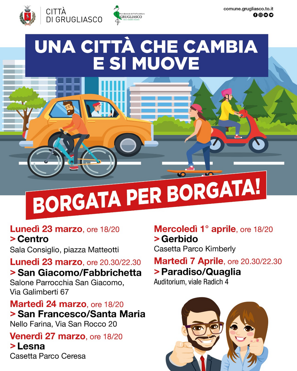 Grugliasco è una città in evoluzione, una città che cambia e si muove, borgata per borgata! E con questo slogan sono stati organizzati una serie di incontri nelle singole borgate per parlare con i cittadini del Nuovo Piano Generale del Traffico Urbano e delle linee di indirizzo per l'aggiornamento del Piano Regolatore Generale.