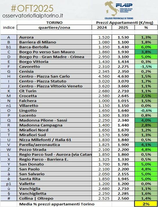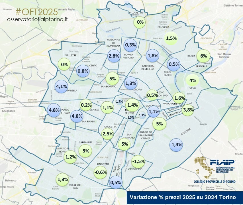 Come detto ecco la crescita dei prezzi, mediamente del 2%, che premia soprattutto i quartieri a ridosso del centro e le aree interessate da processi di riqualificazione. San Salvario, San Donato e Borgo Po guidano l’aumento dei valori, mentre il semicentro si conferma dinamico con Santa Rita, San Paolo e Parella. Tra le sorprese spicca Barca-Bertolla, che con un +6% registra una delle crescite più significative grazie a prezzi accessibili e alla presenza di aree verdi.